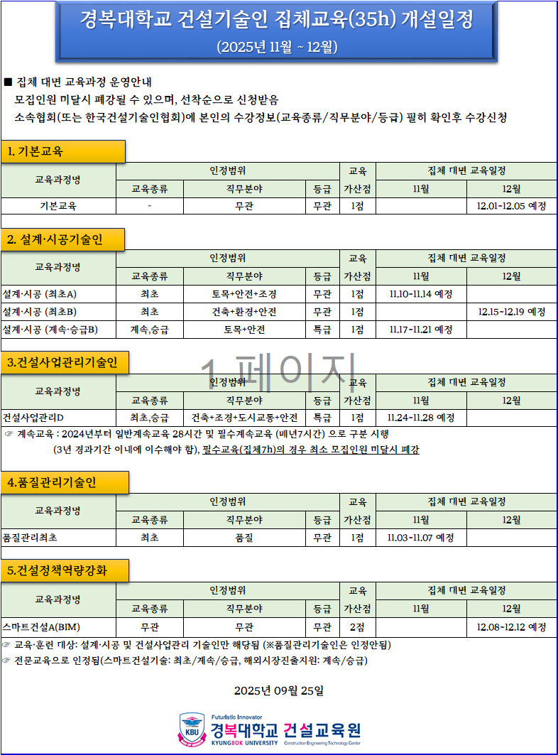 2025년도 11월-12월 집체교육(35시간) 개설일정 안내