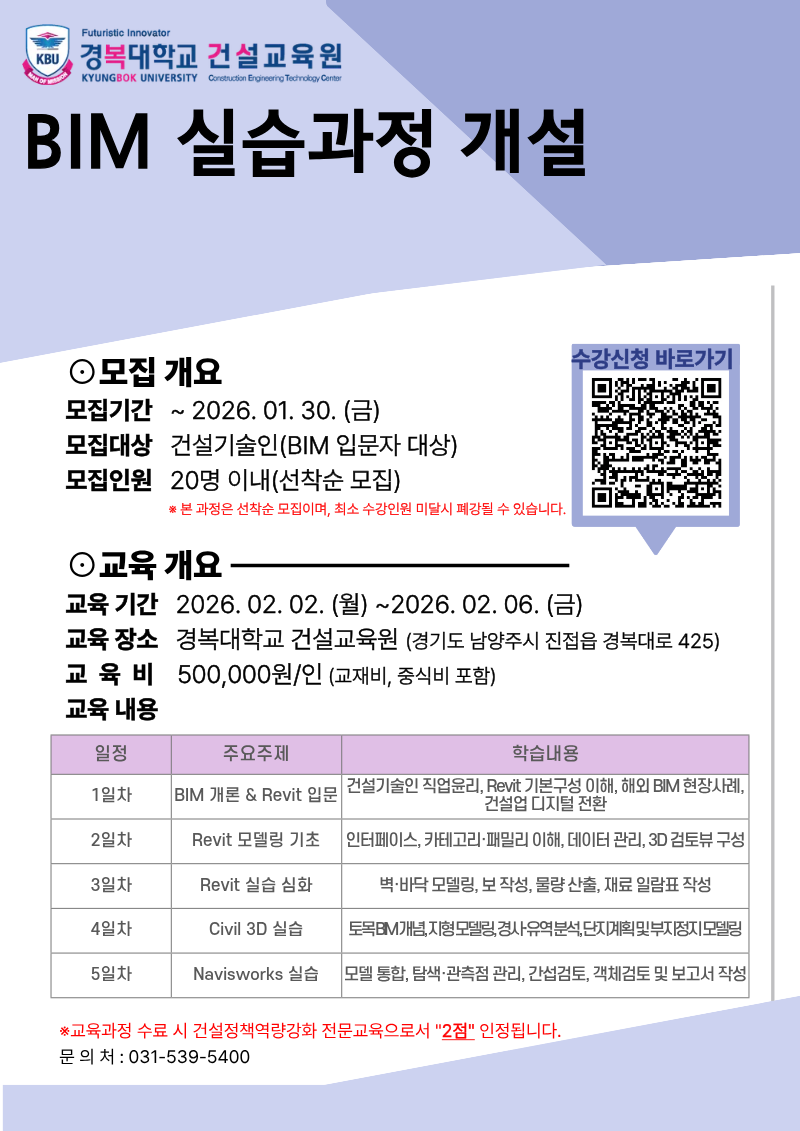 신규 집체교육(BIM 실습 과정, 35H) 개설 안내