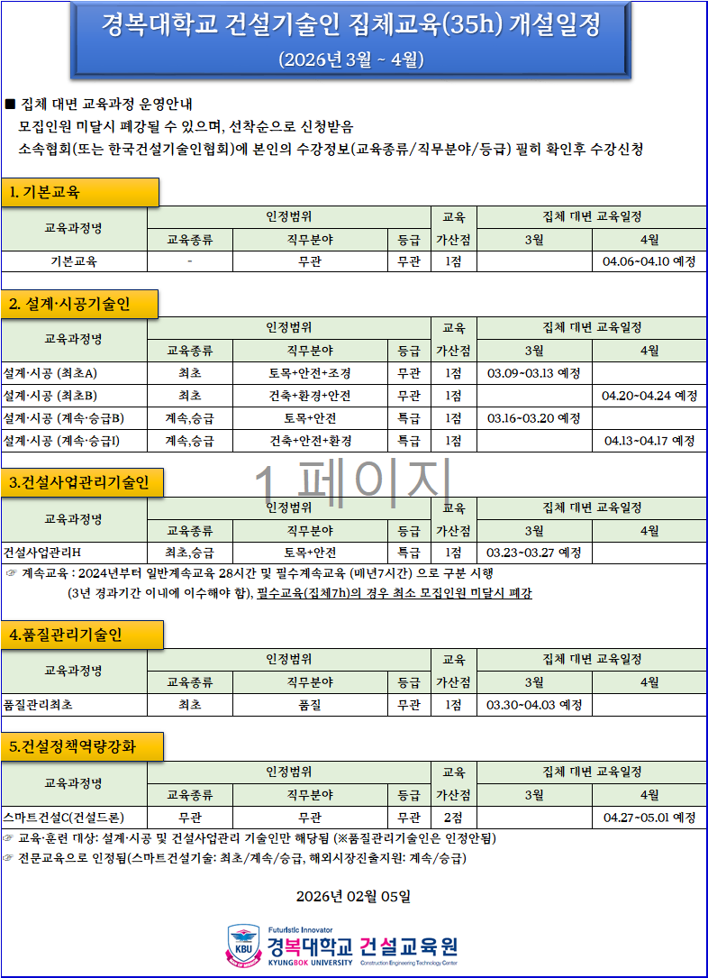 2026년도 3월-4월 집체교육(35시간) 개설일정